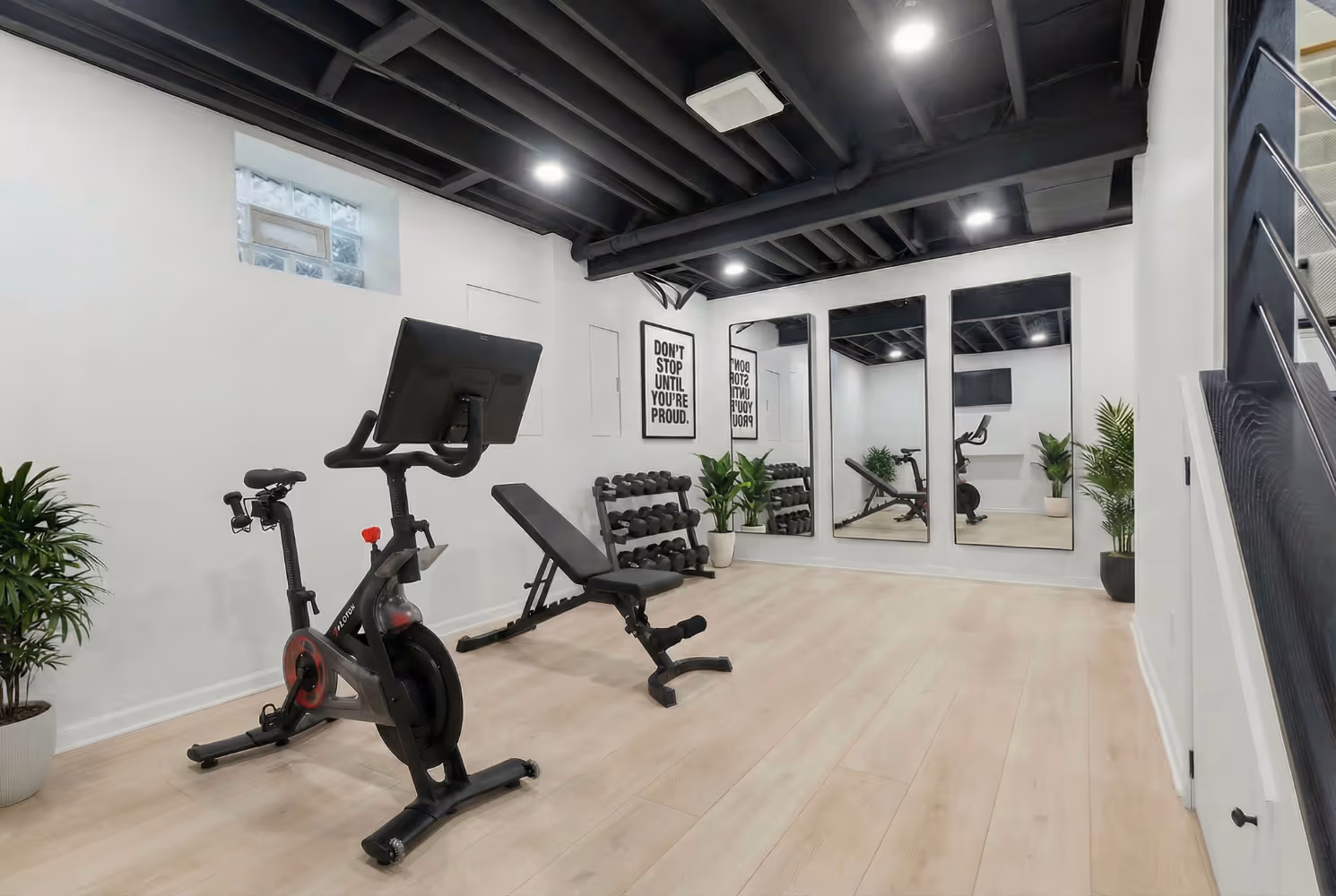 To further support the family’s lifestyle, we designed a dedicated home gym rather than simply allocating open floor space for equipment. Flooring was selected for durability and sound absorption, ceiling clearances were carefully evaluated, and proper electrical planning ensured the space would comfortably accommodate a range of fitness equipment. The finished gym creates a motivating, convenient environment that makes prioritizing health both convenient and practical.