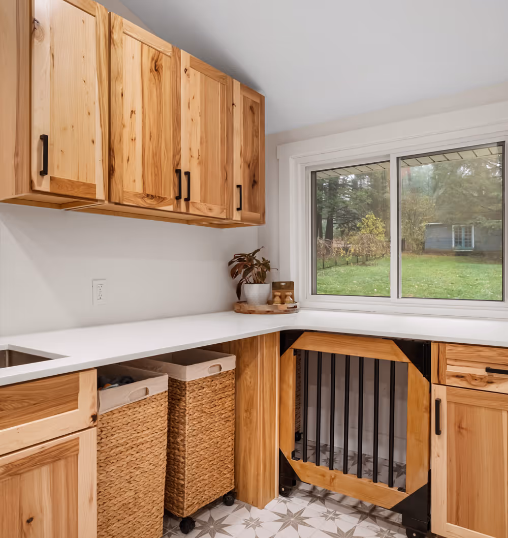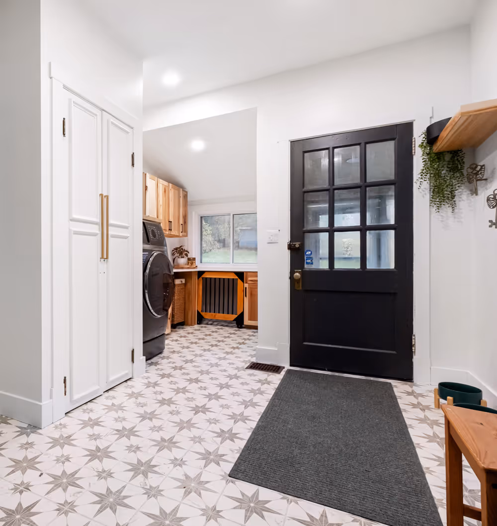 Our renovation involved a complete overhaul and re-design to meet their vision. This included re-using old doors to maintain the traditional feel of the house, while building custom closets and pantry storage to meet the homeowners’ needs. Other features met the custom needs of the clients: a dog crate, a sink, a new combination washer and dryer, and new tile flooring.